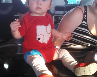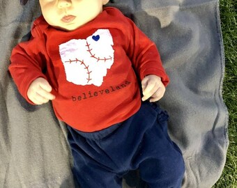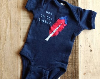 GO TRIBE!!! Celebrate your little one and cleveland with this state of ohio bodysuit, complete with baseball stitches and a heart on cleveland. CHOOSE any combo of the state/heart and whether you like matching stitches or contrast stitches, SEE above photos for examples.