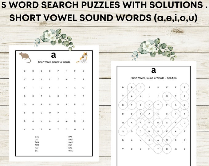 5 Word Search Puzzles With Short Vowel Sound Words (a,e,i,o,u) l Vowel Sound Recognition