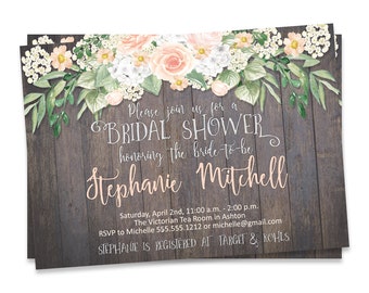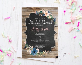 Floral Bridal Shower Invitation, Printable Rustic Bridal Shower invite, wood bridal shower invite, rustic boho bridal shower invite