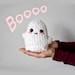 A cute crochet ghost plushie 👻that is perfect for any spooky lover out there