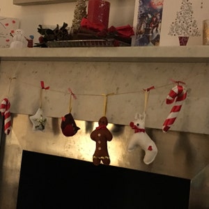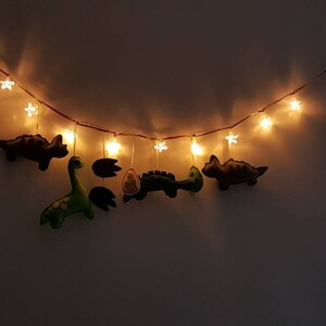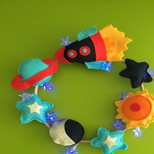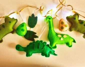 The lights are made up of 7 handmade felt shapes and double satin aqua blue ribbons are twisted around the lights to hang the shapes.