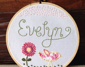This 6", hand-embroidered hoop features a sweet purple and dark turquoise birdie and the word "tweet" in pale purple. It also has delicate glass beads stitched at the bird's feet. If you would like different colors of thread, please contact me before ordering to be sure I have your color choices in stock.