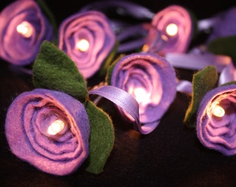 These pretty and delicate deep pink Sleeping Beauty Rose Fairy Lights are handmade from felts with satin ribbons. They would make a beautiful addition to a child's room, a perfect romantic gift, a lovely addition to any wedding decor, or a pretty mother's day gift.