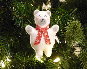 Even polar bears get cold sometimes. This little gal's mama made sure she wouldn't get the sniffles by putting her in a nice warm sweater. This felt ornament is perfect for little hands, as it won't break when dropped. Her snazzy sweater is personalized with your choice of initial embroidered in the middle.