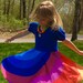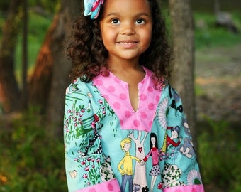 The split bodice is unique and offers a nice shape to the overall dress. A full skirt is attached, giving the dress plenty of play room with out being overly twirly or cumbersome. A hemband that matches the upper part of the bodice finishes the dress, and a bright solid sash finishes it off. Super, fun and very fun!!