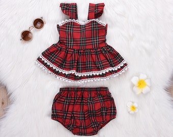 Materials: taffeta, acetate, lace, polyester, cotton, red, holiday wear, plaid, blue, bow