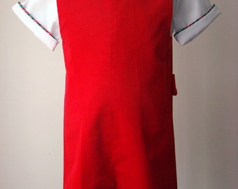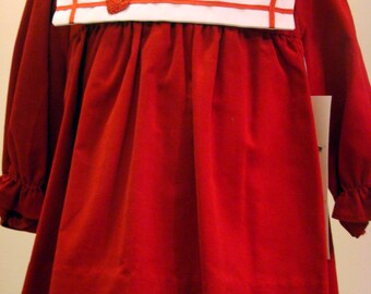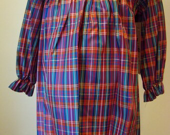 This one-of-a-kind 100% acetate taffeta dress has a holiday plaid with a blue background with , green, red, white, and black plaid lines. The white square bib eyelet-lined collar has a novelty lace edging around the front and back. There is a red bow sewn on the bottom of the collar on the side. The dress is gathered in a high yoke in the front and back and the sleeves are long with an elastic ruffle at the cuff. There is a zipper located in the back of the dress. The dress is new with tags and can be worn all year round since the fabric is 100% cotton.