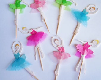 12 Lovely Ballerina Cupcake Cake Picks Paper with Tulle 3 3/4"h