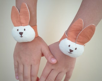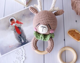 Nursing bracelet, rattle for baby. Teething ring toy with crochet wooden beads in green and grey