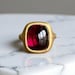 Gold Ruby Ring set with Created Ruby in a perfect diamond cut & intense red color, at size 10x8mm, 3 Carats. Band Width 1.2mm. Vintage Ruby Ring made of Gold Vermeil: 18k Gold over Solid 925 Sterling Silver ☞ made to last.