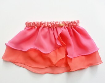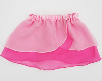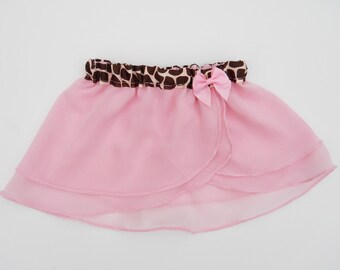 This faux wrap ballet skirt gives the appearance of being wrapped around the waist but has the ease of being pulled on with an elastic waistband. It is made with a double layer of soft chiffon fabric for beauty and modesty. The fabric flows with every movement. It is finished with a rolled hemline which creates a pretty, sweet, ruffled look. It has a comfortable, incased elastic waist, covered with mint green and white polka dot grosgrain ribbon, and finished with a little pink bow.