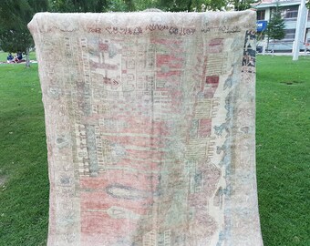 Vintage Large Oushak Turkish Rug with Modern Design in Muted Warm Colors, Shabby Chic Antique Carpet with Pictorial Pattern 5'6'' X 8'6''