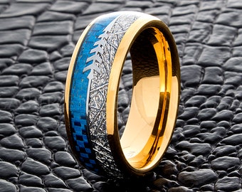 Tungsten Wedding Ring Blue Carbon Fiber Meteorite Arrow Yellow Gold 8MM Tungsten Wedding Band Men's Tungsten Ring Tungsten Band Men's Ring