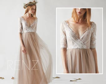 Bridesmaid Dress Pale Khaki Tulle Dress Wedding Dress Off White Lace 3/4 Sleeves Maxi Dress,Beaded Illusion Deep V Neck Prom Dress(HS529A)
