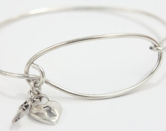 Heart Lock & Key Charm Sterling Silver Bracelet Bangle , Sterling Bangle, Boho Bracelet, charm bracelet
