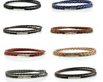 Genuine Leather Bracelet-Double Wrapped Braided Leather Wristband-Sterling Silver Push and Twist Clasp