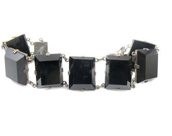 Black Jet Rock Crystal Bracelet. Art Deco Japanese Sterling Silver Black Quartz Crystal Link Bracelet.