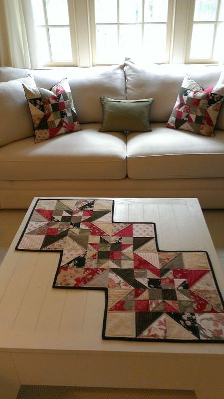 The lights and darks of the fabrics, along with the black zigzag edging, make this a stunning table runner or bed runner. It would also look great for Valentine's Day decor, who says you have to use hearts.