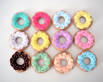 This listing is for 4 Felt Iced Cookies: Milk Chocolate, Violet Vanilla, Blueberry, and Strawberry. Each iced cookie measures 2 ½ inches in diameter, is hand stuffed and stitched, and made of felt, beads and cotton batting. Each cookie is reinforced with heavy cardstock for durability and to feel more lifelike. These cookies are packaged for you in a gift box that measures 4 inches x 4 inches x 4 inches.