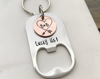 Stainless steel Bottle opener handstamped customized penny with initials gift for him or her 7 year anniversary gift copper jewelry -