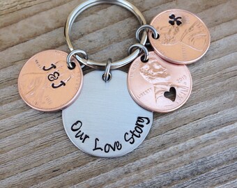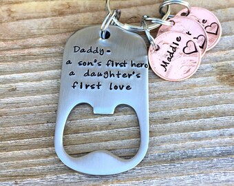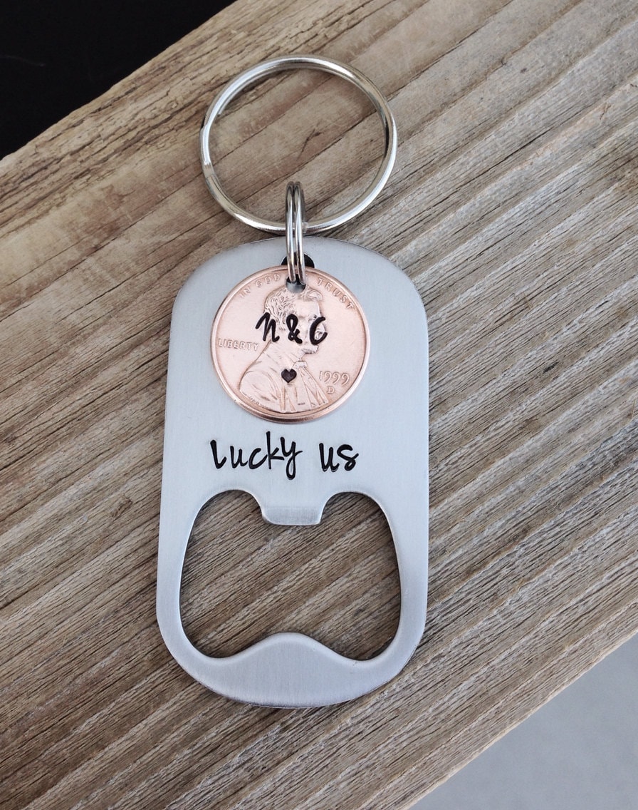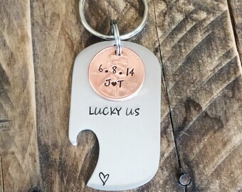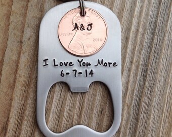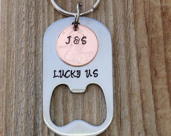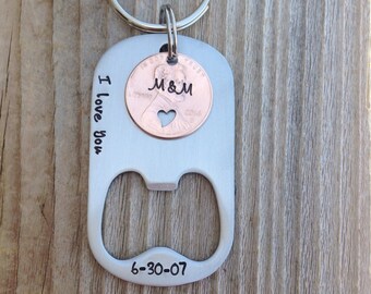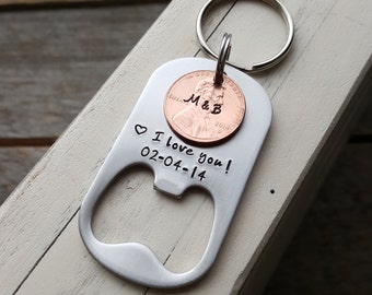 Bottle opener hand stamped customized penny 7 year anniversary gift copper lucky penny jewelry boyfriend gift husband gift Valentine gift