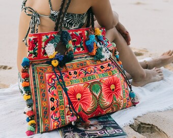 One of a kind Beach Large Tote Bag for Women, Fair Trade Boho Tote, Yellow Floral Hmong Embroidered Tote/Shoulder Bag - BG0033-00-YEL