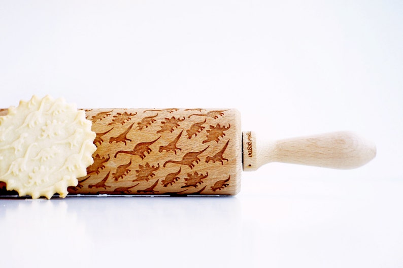 This wooden rolling pin is engraved with the coolest dinosaur pattern!