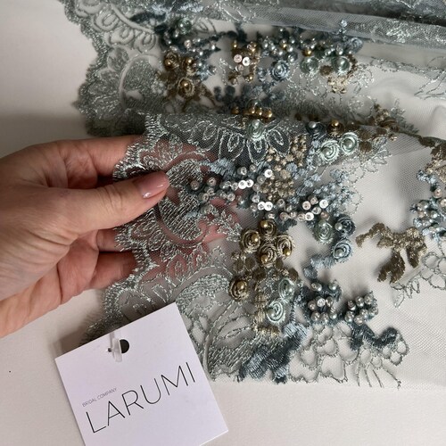 Matte wedding lace with dense floral embroidery. Embellished with sequins and beads. Perfect for wedding dresses and veils.