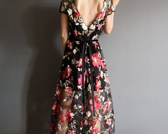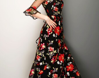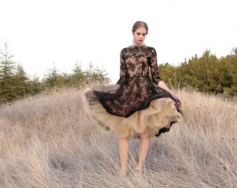 Maxi Silk and Lace Black Gown Unique Handmade Nude Dress Haute Couture