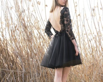 Maxi Black Open Back Lace Evening Gown Tulle Skirt Prom Ball Wedding