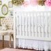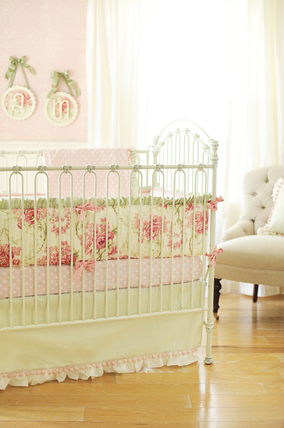 Reminiscent of times gone by… our Roses for Bella Crib Bedding is a classic. The beautifully put together bumper is made of Roses for Bella fabric paired with Taffeta in Cream & trimmed with a Thin Green & White Stripe ruffle. All bumpers are slip covered for easy cleaning. Piping & ties are of Taffeta in Honeysuckle fabric. The sheet is Lil Pink Dottie 100% cotton fabric & machine washable. The sweet 17" skirt is tailored Thin Green & White Stripe trimmed with Pink Pom Poms and a 3 inch ruffled band of Taffeta in Cream. Roses for Bella’s Blanket is Lil’ Pink Dottie piped in Roses for Bella fabric accented with a Thin Green & White Stripe ruffle. The two piece set includes a crib sheet and skirt. The three piece set is a bumper, sheet and skirt. The four piece adds a blanket. Handmade in the USA.