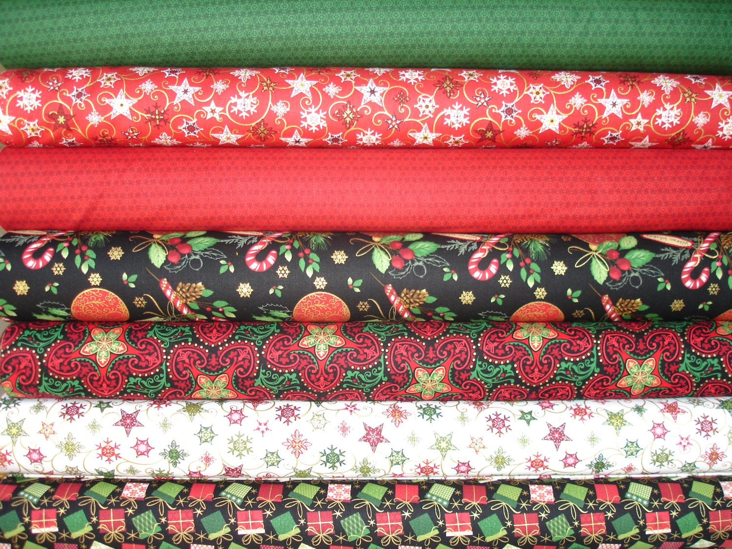 Gorgeous holiday fabrics with bold black, red, green and metallic. Just imagine what you can do with this bundle.