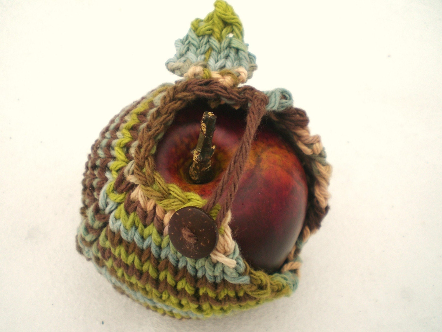 This hand knit apple cozy is made with multi-colored cotton yarn and a wooden button.