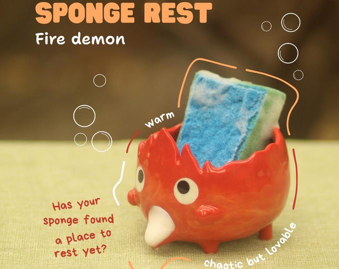 Pre-order Handmade Ceramic Sponge Holder, Fire Demon Kitchen Decor,Valentine Gift, Whimsical Dish Scrubber Holder,Gift for Home