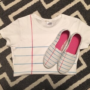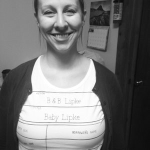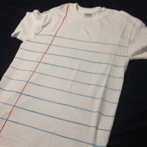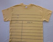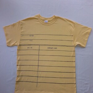 The Library Due Date Card Graphic© and hand lettering are carefully applied by hand. The variations in each shirt create an unique, one of a kind product.