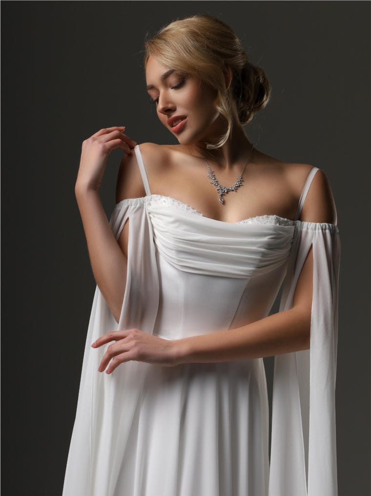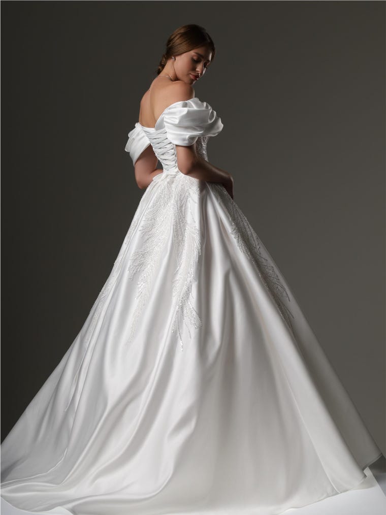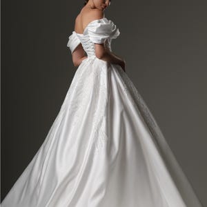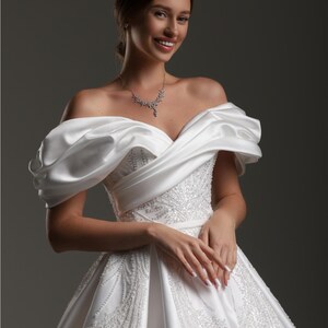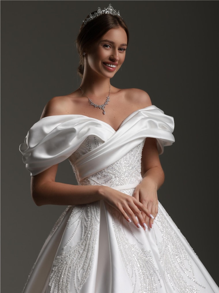 This romantic off-shoulder wedding dress is crafted from royal satin and sparkly tulle, creating an ethereal bridal look. The milk-white gown features long transparent sleeves, a softly draped bodice, and a graceful A-line skirt with a front slit. The lace-up corset back ensures a perfect fit, while the elegant train adds a majestic touch. Ideal for modern, fairy tale, or classic wedding themes.