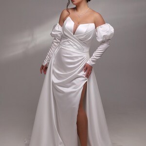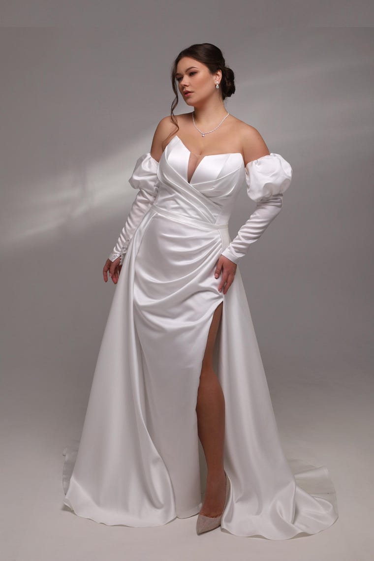 Romantic Plus-Size Wedding Dress with Off-Shoulder Sleeves, Draped Bodice, and High Slit, Elegant Handmade Wedding Dress, boho wedding dress