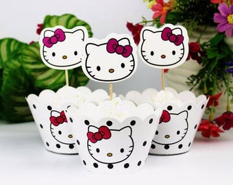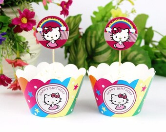 12 pcs Toppers +12 pcs Wrappers Hello Kitty Cartoon Cake Decor Cupcake Decoration For Kids Cartoon Birthday Party Supply