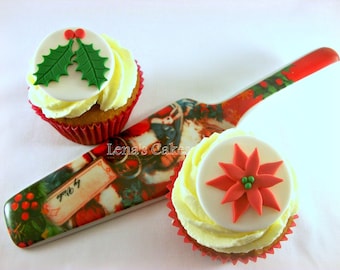 Christmas Cupcake Fondant Edible Toppers, Xmas Party Decor, Poinsettia Holly Leave Edible Toppers, Holiday Edible Decorations - set 12