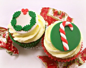 Christmas Cupcake Fondant Edible Toppers, Xmas Party Decor, Wreath Candy Cane Edible Toppers, Holiday Edible Decorations - set 12