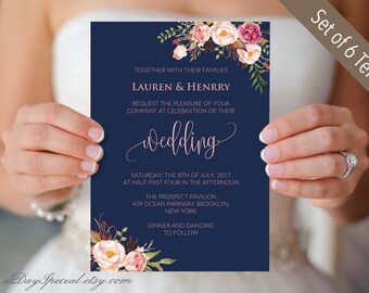 Set of 5 Navy Wedding Invites Suite, Printable Pink Floral Wedding Invitation Templates, Rustic Boho Chic, DIY PDF Digital Download #103