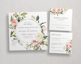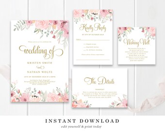 Floral Wedding Invitation Suite, Printable Wedding Invitation, Pink and Gold Flower Invitation, Digital Instant Download, Kristen
