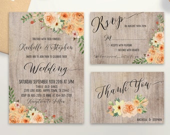 Peach Wedding Invitation Suite, Printable Rustic Wedding Invitation Set, Floral Wedding Invitation, Watercolor Wedding Invitation WTCW