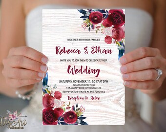 Navy Burgundy Wedding Invitation Set Printable Merlot Floral Wedding Invite Rustic Peony Bohemian Wedding Invitation Suite Digital / Printed