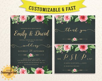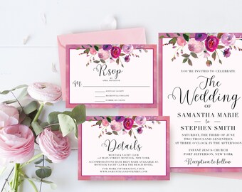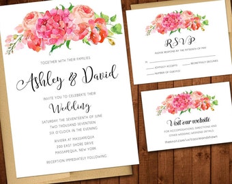 Floral Wedding Invitation Suite, Printable Watercolor Wedding Set, Pink Flower Wedding Instant Invites, Printable Kate Inspired Wedding Set