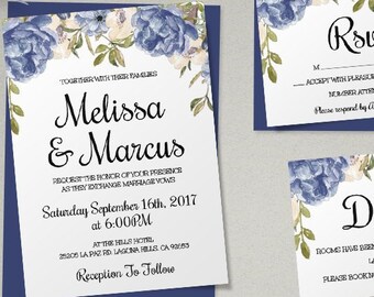 Blue Floral Wedding Invitation, Floral Wedding Invitation Suite, Printable Invitation Set, Editable Wedding Invite, Instant Download, Peony