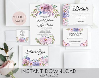 Wedding Invitation Template Set, Wedding Invitation Suite, Printable, Invite Set, Wedding Invitations, Wedding Invites, Watercolor, Floral