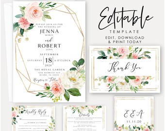 Blush Floral Wedding Invitation Set, Gold Geometric Wedding Suite, Printable Wedding Editable Template Wedding Invitation Kit Thank You Card
