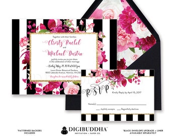 WEDDING INVITATIONS SUITE Wedding Invitation Set 2 Piece Wedding RsVP Invites Black White Striped Pink Ready Made Printed - Christy