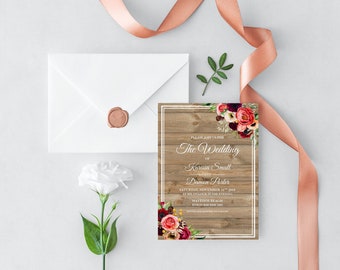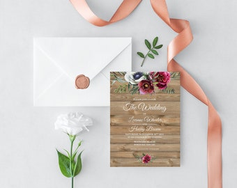 Burgundy Wedding Invitation Printable Wedding Invite Rustic Marsala Blush Wedding Invitation Set Boho Floral Wedding Invite Digital-Printed